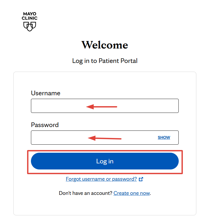 To get logged in, visit the Mayo Clinic portal login page (https://onlineservices.mayoclinic.org/patientportal).